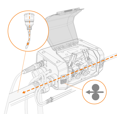 | 5. | Guide the filler wire through the inlet guide tube, middle guide tube and into the outlet guide tube, which feeds the filler wire to the welding torch. |