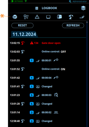 Logbook collects information about system operation and welding into one view for monitoring and troubleshooting. You can use filters (*) to show/hide content. Selecting an event displays additional information if available. Reset clears the Logbook and Weld history, Refresh updates the displayed information to show the latest logged events.