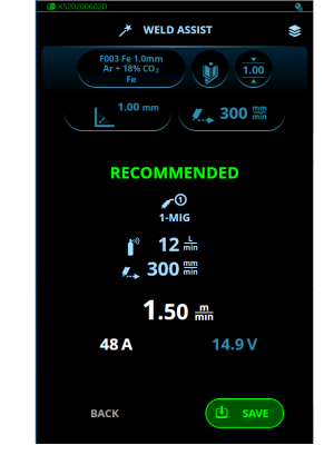 | 4. | Guarde la recomendación de Weld Assist para los ajustes de soldadura seleccionando "Guardar". |