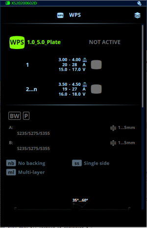WPS-näkymä näyttää ne digitaaliset hitsausohjeet, joissa on kyseiselle hitsausasemalle Kempin WeldEye-pilvipalvelussa määriteltyjä hitsipalkoja.