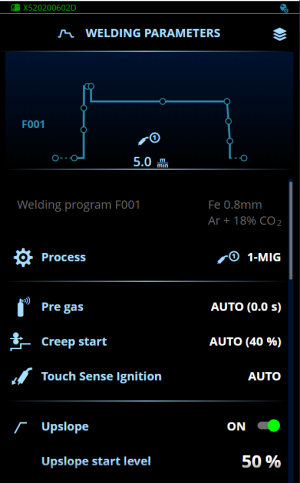 Upslope is een lasfunctie die de tijd bepaalt, gedurende welke de lasstroom aan het begin van de las geleidelijk wordt verhoogd tot het gewenste niveau. Het upslope-startniveau en de tijd worden vooraf ingesteld door de gebruiker. |