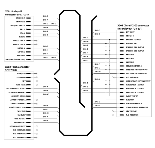 | • | O conetor do cabo de controlo Dinse FD300 é substituído por conectores adequados para o R500 Wire Feeder HD EUR+. Estes conectores de cabos de controlo podem ser encomendados em Kemppi.com. |