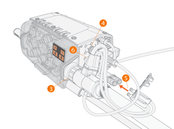 | 5. | Se você tiver a unidade de arrefecimento opcional, conecte as mangueiras (5) do líquido arrefecedor. |