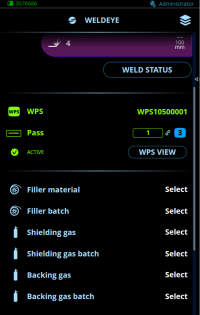 As soldas e as passagens de solda na ordem de serviço podem ter WPSes (especificações do procedimento de soldagem) digitais anexadas a elas. Quando uma ordem de serviço é selecionada e tem um WPS ou WPSes incluídos, uma linha de WPS é mostrada na visualização do WeldEye.
