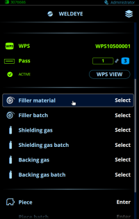 Se nenhum WPS for selecionado, você poderá ir para a linha WPS na visualização do WeldEye e selecionar um WPS disponível.