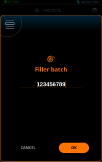 A seção inferior da visualização do WeldEye mostra o material do arame de enchimento e as informações sobre o gás, incluindo a identificação do lote (se e conforme necessário).