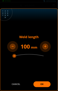 Ao concluir uma passagem de solda, o comprimento da solda pode ser inserido na visualização do status da solda selecionando o símbolo de comprimento e “Definir comprimento” (*).