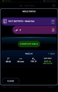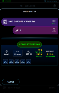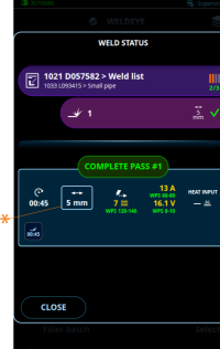 Após a conclusão do trabalho (ordem de serviço, solda, passagem de solda), ela pode ser confirmada na visualização do status da solda, que é aberta logo após a conclusão de uma solda. Essa visualização também substitui a visualização de dados de solda padrão no uso do WeldEye.