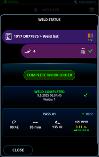 Mesmo que todas as soldas individuais estejam marcadas como concluídas, a ordem de serviço em si também deve ser concluída na visualização do WeldEye. |