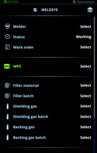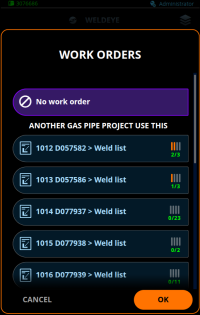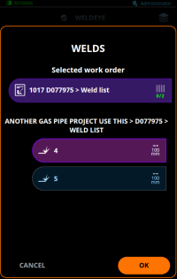 Caso o uso de ordens de serviço tenha sido desativado nas configurações do WeldEye, as soldas são selecionadas diretamente de uma lista (categorizada por projetos e/ou listas de soldas) e o filtro de soldagem específico do soldador não é aplicado. |
