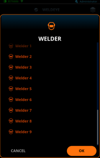 A visualização do WeldEye permite selecionar o soldador para o trabalho de soldagem em questão. Os soldadores são predefinidos no serviço de nuvem do WeldEye.