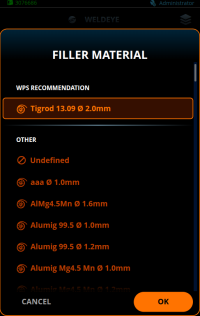 Um WPS digital pode incluir várias recomendações de material de enchimento e gases. Você pode verificar e alterar os materiais recomendados na visualização do WeldEye. |