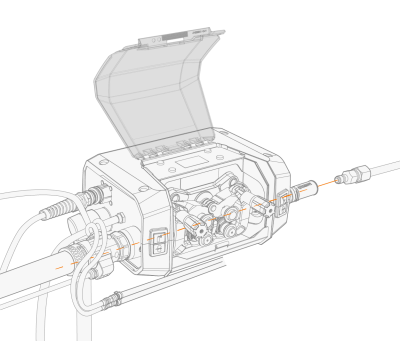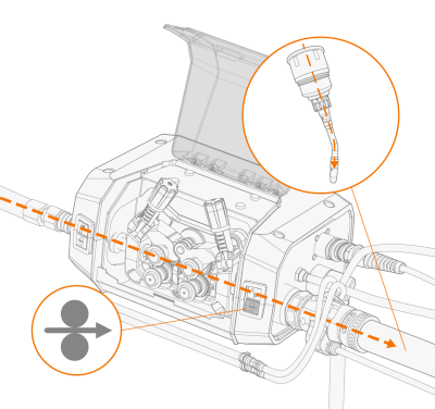 | 5. | För in tillsatsmaterialet genom inloppsröret, mellanstyrröret och in i utloppsröret som matar tillsatsmaterialet till svetspistolen. |