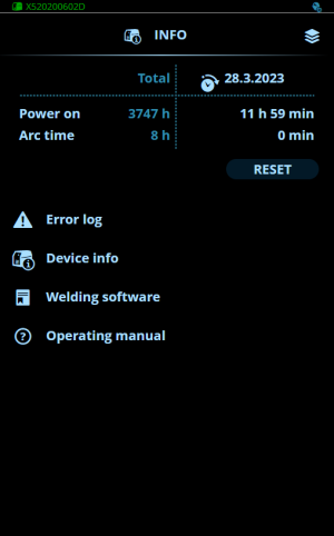 信息视图显示了有关设备使用的信息。通过此视图还可以访问错误日志、已安装的焊接程序列表、其他操作信息和设备信息,如激活的许可证、软件版本和设备序列号。