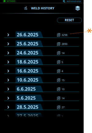 焊接历史记录视图可将过去进行的焊接的相关信息收集到一个视图中,以供后续检查。右侧显示的是当天事件的数量(*)。视图会自动更新,以显示最新记录的事件。选择一行以打开焊接数据视图。重置可清除视图。