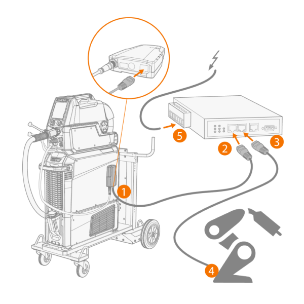您可以将 DCM 和 cobot 控制器连接到现场总线转换器上的任一以太网端口(2 和 3)。 |