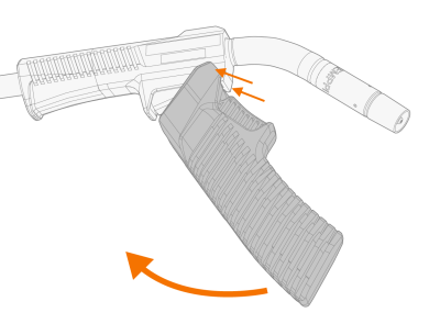 | 1. | Keeping the bottom of the grip handle pointing forward, fit the inside grooves of the grip handle over the screws on the gun. |