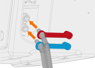 | 2. | 仅水冷型:将冷却液进口和出口软管连接到您的焊接设备。注意接头有颜色标记。 |