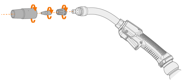 Fixe o adaptador do bico de contato e aperte-o firmemente no lugar usando as mãos. É importante apertar o adaptador corretamente para obter uma conexão firme do bico de contato com a pistola. |