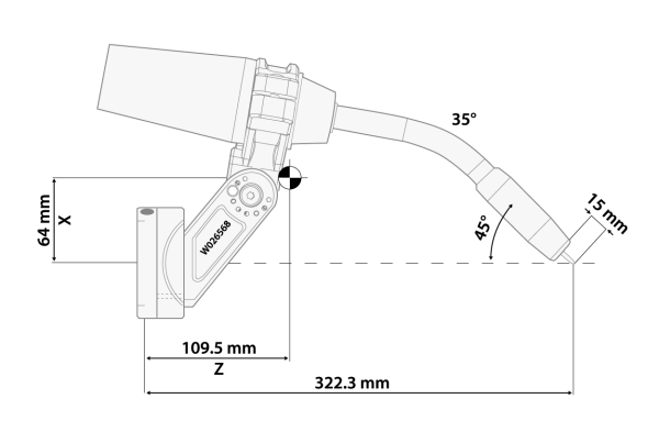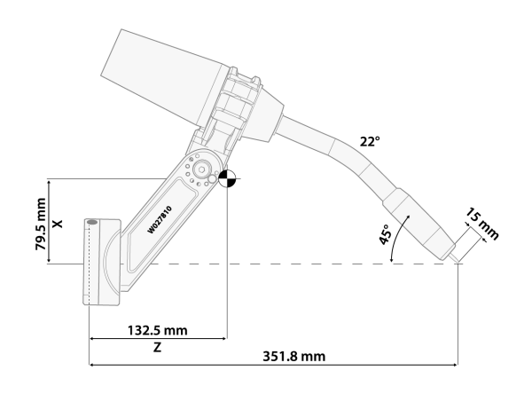 使用六轴协作机器人时,焊枪与工件的最佳角度为 45°。本部分介绍如何使用 Flexlite GXe-C 焊枪鹅颈角度和安装支架组合实现最佳焊枪角度和位置。填充焊丝干伸长为 15 mm。