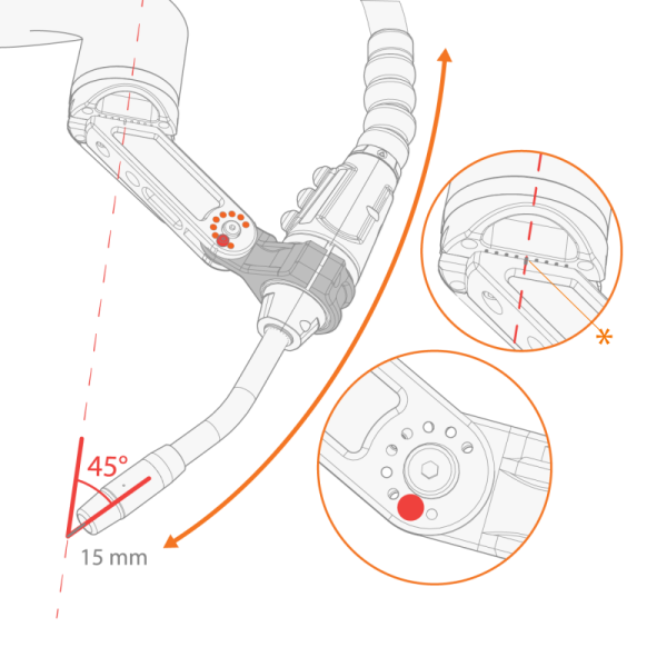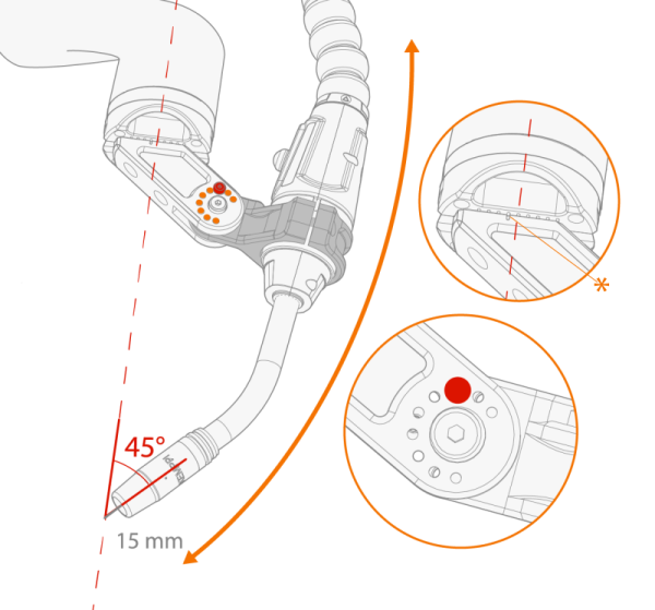 将 GXe-C Bracket Flex Mount M 与鹅颈角度为 22° 的 Flexlite GXe-C 焊枪一起使用并按如下方式调整(注意对齐标记*):