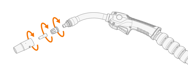 | 1. | 连接导电嘴转接器并用手将其牢固拧紧到位。正确拧紧适配器以使导电嘴紧密连接到焊枪是非常重要的。 |