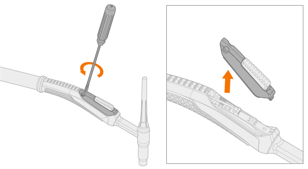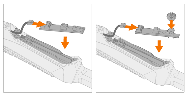 Conecte la placa de circuitos del control remoto de la antorcha al conector y colóquelo en su ranura en el mango. (El modelo de interruptor basculante se muestra a la izquierda y el modelo de interruptor de rodillo a la derecha:) |