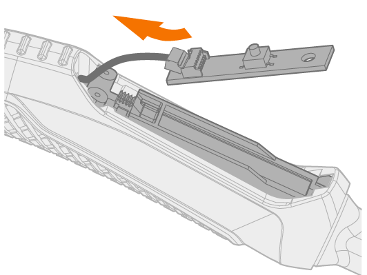Saque la placa de circuitos existente de su ranura en el mango y desenchufe el conector. |