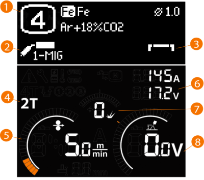 Główny widok panelu sterowania Master M składa się z ekranu ustawień i ekranu spawania. Wyświetlana treść zależy od procesu spawania oraz zastosowanych funkcji.
