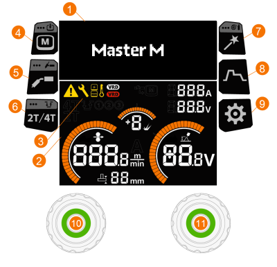Panel sterowania Master M zawiera funkcje do spawania MIG z opcjami używania Master M również do spawania metodami TIG i MMA.