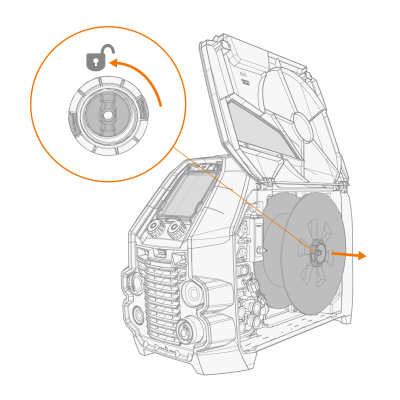 | 2. | Poluzuj i zdejmij mocowanie szpuli i wyjmij szpulę drutu. |