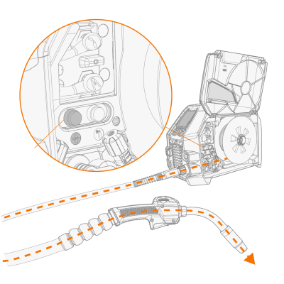 | 8. | Aby wprowadzić drut elektrodowy do uchwytu spawalniczego, naciśnij przycisk wysuwu drutu (*). Zatrzymaj, gdy drut osiągnie końcówkę prądową uchwytu spawalniczego. Prędkość podawania drutu można regulować na panelu sterowania. |