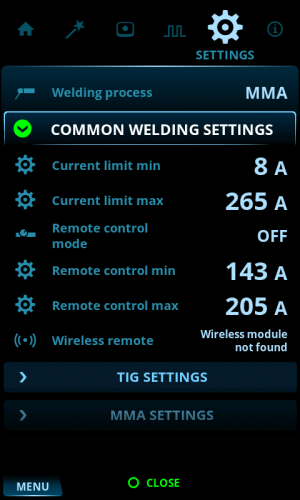Some of the settings are e.g. current mode and welding process specific and are visible or not visible in the settings menu accordingly. |