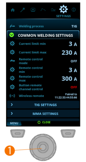 | Welding process | TIG / MMA / Cleaning / Polishing (Default = TIG) | Selecting a welding process changes automatically to the last active channel for the selected process. |