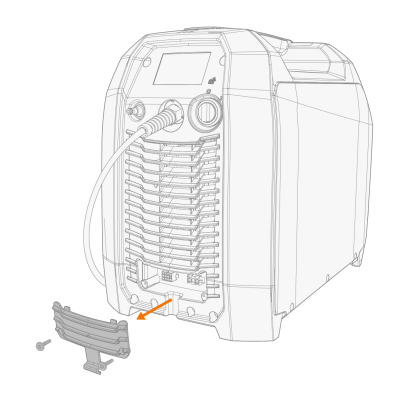 Zdemontuj niewielką osłonę złącza w tylnej części źródła prądu. |