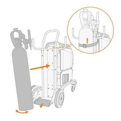 | 2. | 有保护气瓶推车:将保护气瓶移动到搬运单元的气瓶架上,并使用提供的皮带和固定点将其固定在适当的位置。 |