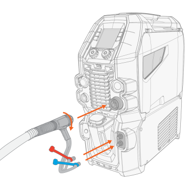 | 2. | 如果您的设置包括带冷却单元的电源和水冷焊枪,则也要连接冷却液接口。软管使用颜色编码。 |