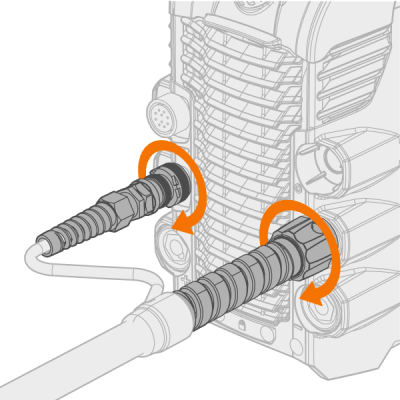 Connect TIG torch cables and the water cooling inlet and outlet hoses to the units. Secure by turning the connectors clockwise. |