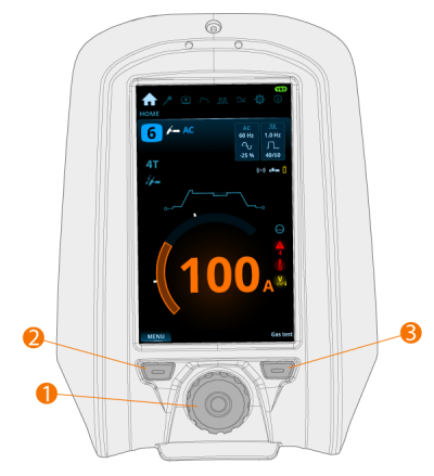 Na visualização inicial, girar este botão ajusta a corrente de soldagem (A) |
