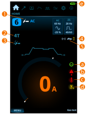 A visualização da Página inicial é o “modo de trabalho” do painel de controle após a inicialização do equipamento e do painel. Quando se está na visualização da Página inicial, a corrente de soldagem pode ser ajustada diretamente girando o botão de controle.