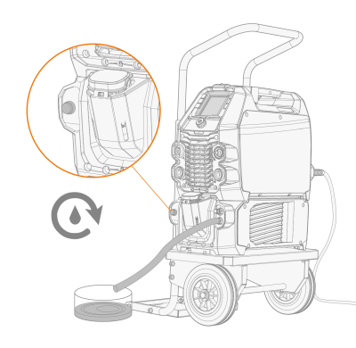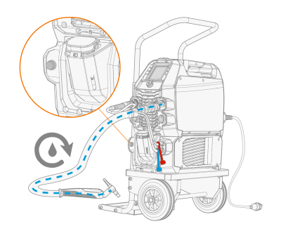 Нажмите кнопку циркуляции охлаждающей жидкости на передней панели охладителя. Она активирует двигатель, который подает охлаждающую жидкость в шланги и к сварочной горелке.