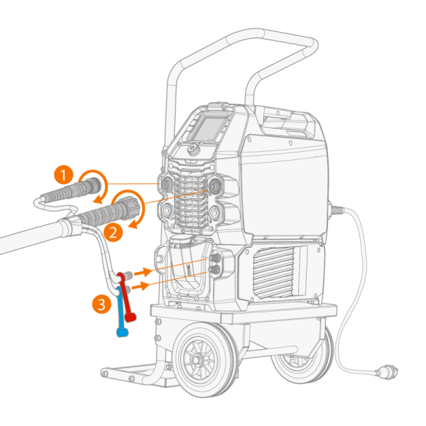 | 2. | 如果您的设置包括水冷焊枪,请将冷却液软管 (3) 连接到冷却单元。软管以颜色编码。 |