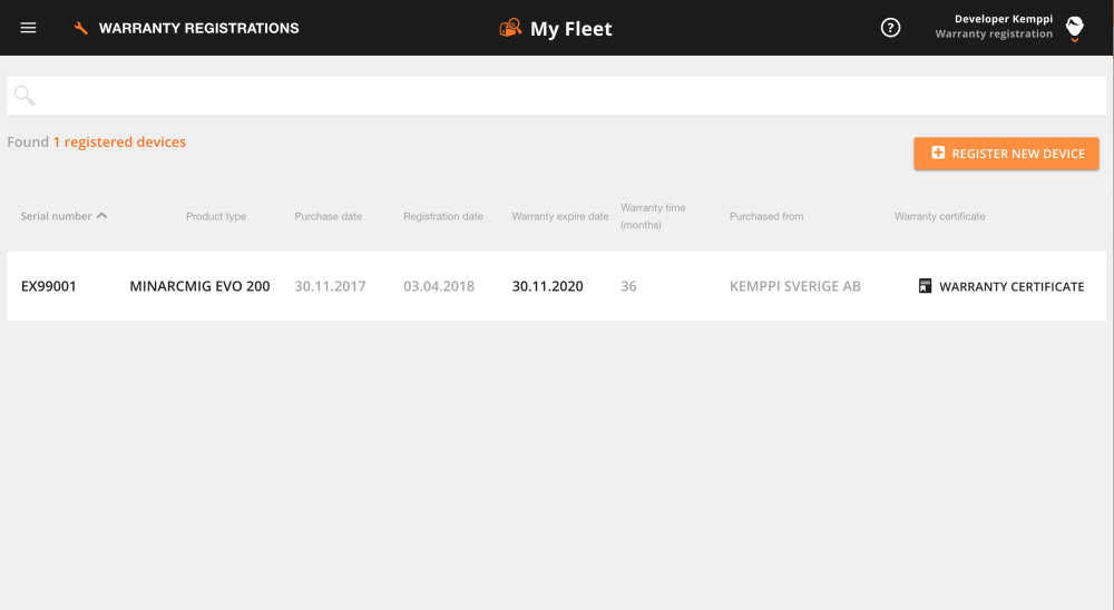| 4. | Warranty registration is now complete and the device is added to the list with updated warranty information and possibility to download Warranty Certificate. |