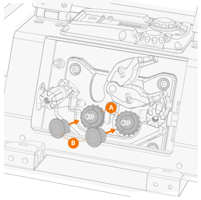 6. Montare i rulli di alimentazione dell'azionamento (A) in posizione, con la sezione del rullo dentata rivolta verso il basso, e installare i tappi di montaggio (B).