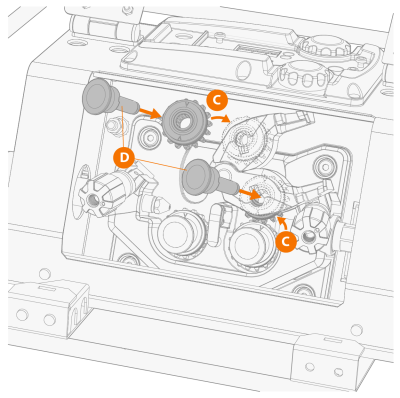 7. Far scorrere i rulli di alimentazione a pressione (C) in posizione, con la sezione del rullo dentata rivolta verso il basso, e installare i perni di montaggio (D).