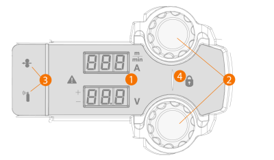 自动控制旋钮激活 :不使用控制旋钮时,它们会自动停用,以防止意外更改焊接参数。将任一控制旋钮旋转四分之一圈即可再次激活控制旋钮功能。激活后,控制旋钮之间的 LED 指示灯 变为绿色。 |