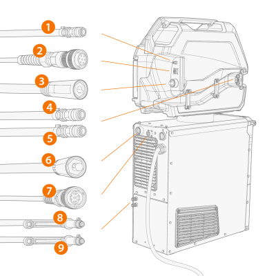 | 1. | 将焊接电流电缆 (3) 连接到送丝机。将电缆推到尽可能远的位置,顺时针旋转连接器,将电缆拧紧到位。 |