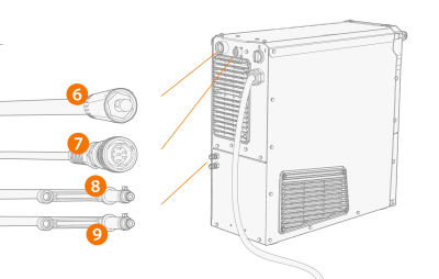 | 10. | 如果您有可选的水箱,请将冷却液软管(8、9)连接到水箱。软管使用颜色编码。 |