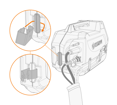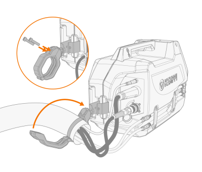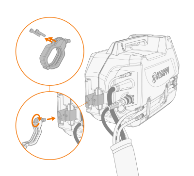 >>5 米及更长的电缆:要固定送丝机中继线的送丝机端,请将额外的支撑支架放在送丝机的后手柄周围,并将电缆夹固定在其上(使用提供的螺母)。