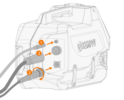| 1. | 将焊接电流电缆 (3) 连接到送丝机。将电缆推到尽可能远的位置,顺时针旋转连接器,将电缆拧紧到位。 |